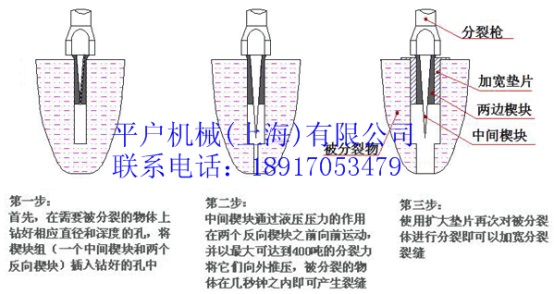 劈裂qiang的工作原理通俗点形容就像用斧头劈柴一样,中间的楔块在液压油缸的推动下伸出,将两边的楔块向两侧张开,以达到使被分裂物体开裂的目的。任何物体都有其自身的特点,岩石和混凝土具有极高的外部抗压强度,而从内部向外的抗拉强度却很小,其抗压与抗拉强度具有100:2--10的差异,处于脆性状态。分裂机抓住岩石与混凝土呈脆性特点,利用楔块原理来设计的--在很狭窄的孔中向外能够释放出极大的分裂力。它由泵站和分裂器两大部分组成,由泵站输出的高压油,驱动油缸,产生巨大推力,驱动楔块组中的中间楔块向前驶出,将反向楔块向两边撑开。其具体实施步骤如下:首先,在被分裂的物体上钻一个特定直径和深度的孔,将分裂机的楔块组(一个中间楔块和两个反向楔块)插入孔中,中间楔块通过液压压力的作用在两个反向楔块之间向前运动,由内向外释放出极大的能量,将被分裂的物体在几秒钟之内按预定方向裂开。